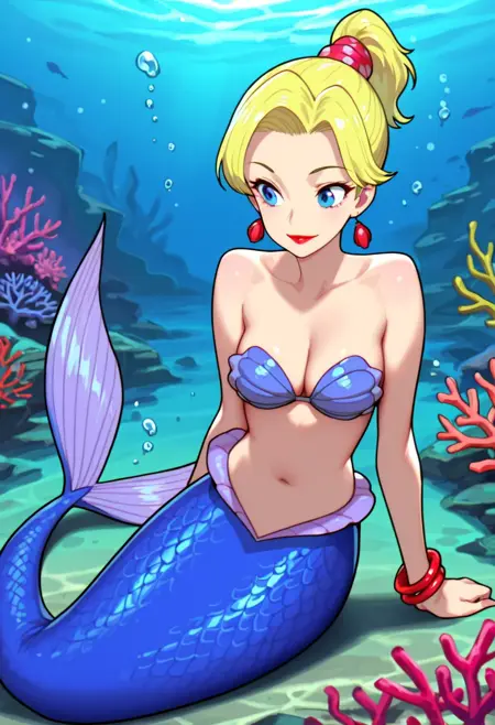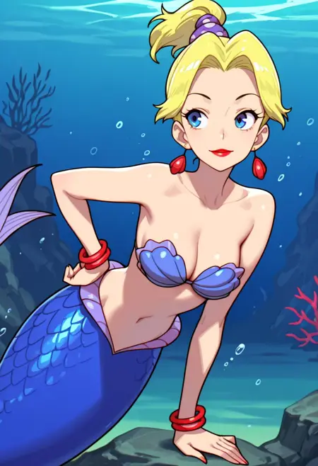 Appearance: blonde hair, ponytail, blue eyes, medium breasts, earrings, lipstick, monster girl, mermaid, blue tail, scales