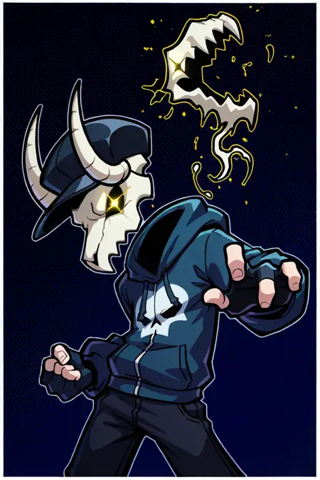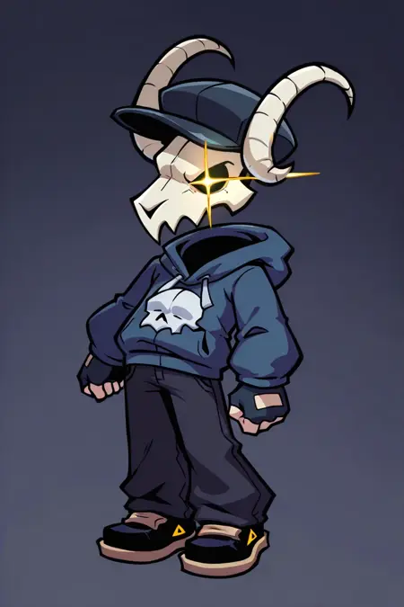 TabiFNF, 1boy, goat's skull, skull head, skeletal hands, dark bluish-gray worker's hat, grayish-blue hoodie, bluish-gray fingerless gloves, dark gray sweatpants, black sneakers, yellow glowing eyes, black sclera, floating head