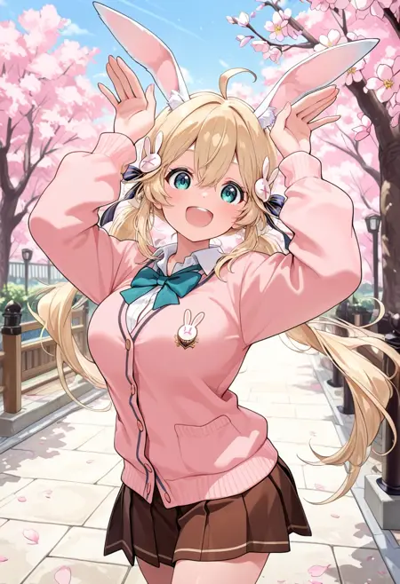 twintails,school uniform,pink cardigan,long sleeves,brown skirt,