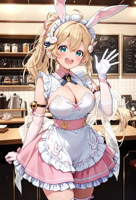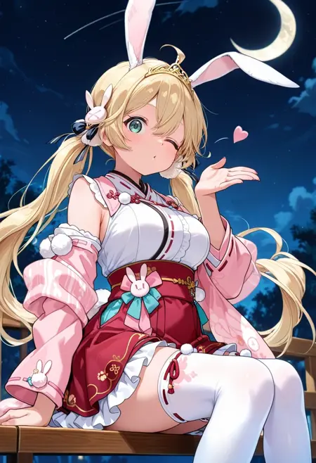 TsukimiSP,blonde hair,long hair,ahoge,hair between eyes,rabbit hair ornament,hair ornament,hair ribbon,rabbit ears,aqua eyes,