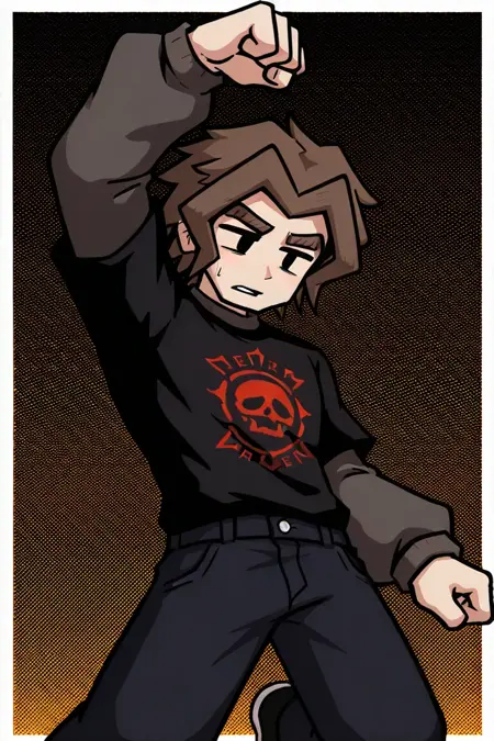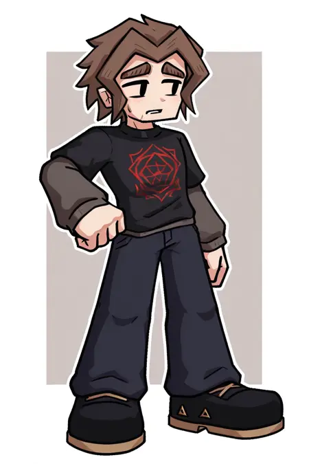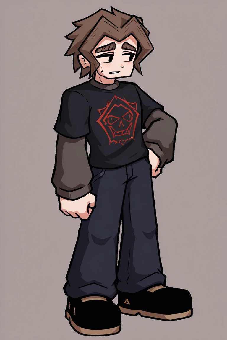 HumanTabiFNF, 1boy, black eyes, no sclera, Shaggy brown hair, angular features, black shirt, dark brown long sleeves, baggy dark blue-black pants, large black shoes, thick brown eyebrows,