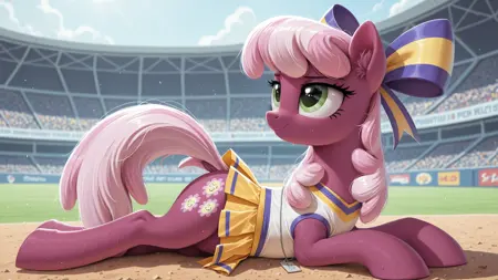 Clothing: cheerleader costume. Purple top with yellow stripes, yellow skirt, multi-layered. A large bow on her head