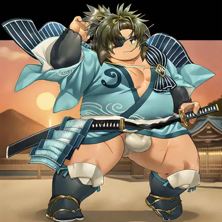 1boy, male focus, solo, chubby, bara, muscular, muscular male, brown-green hair, long hair, messy hair, one-eyed, long toothpick, blue eye,