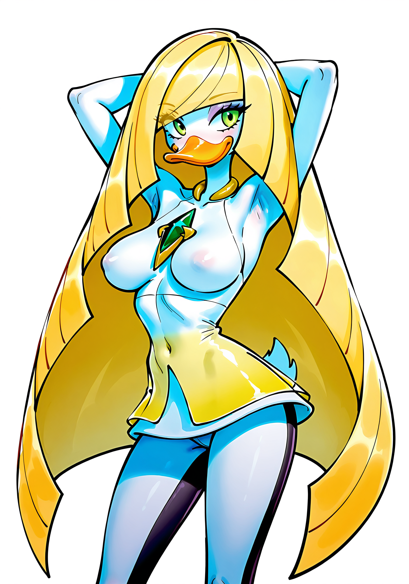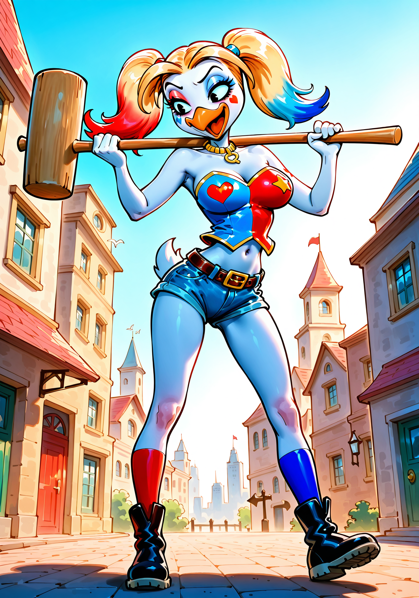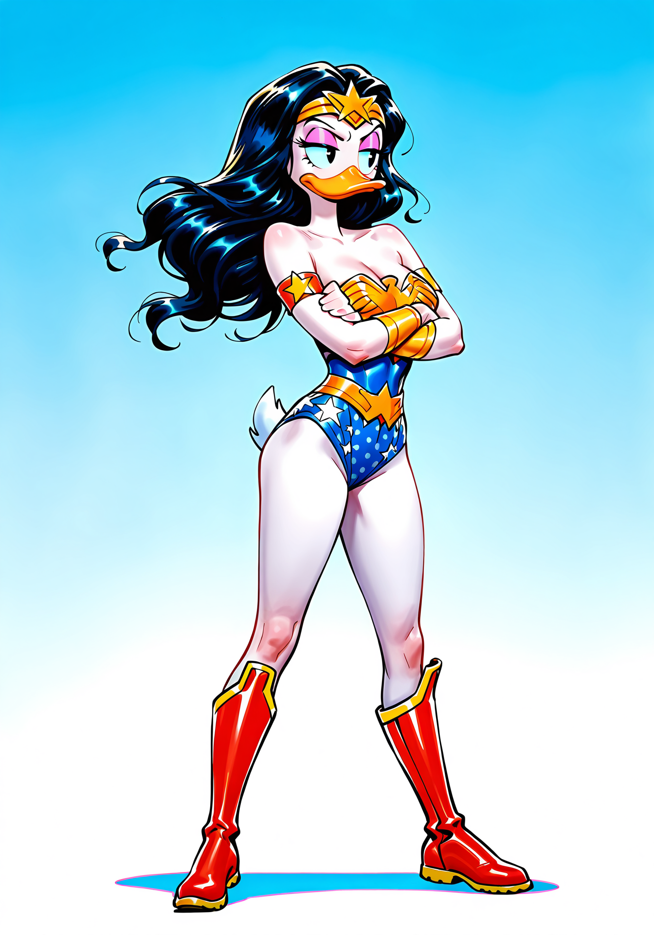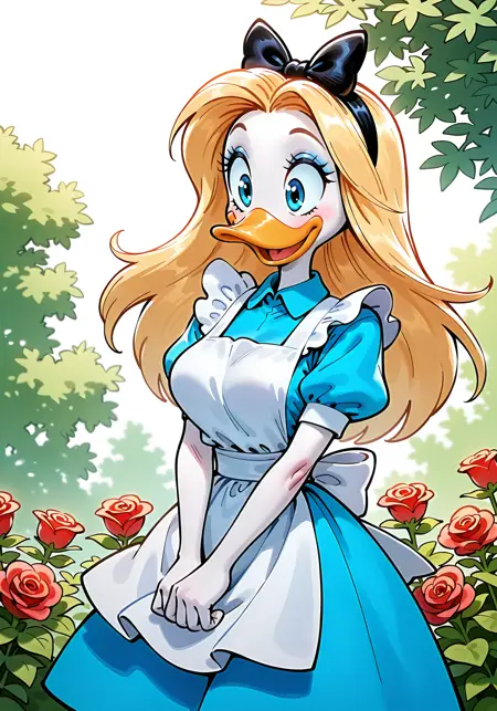 Art used was watercolor paintings, and didn't use any comic scans. Used only female ducks and birds which differ from the comic versions, mainly in more human body shapes (no Daisy pics) and no duck legs. Can generate images without the furry tags in a nice style as well, but you'll probably get duck girls about half the time.