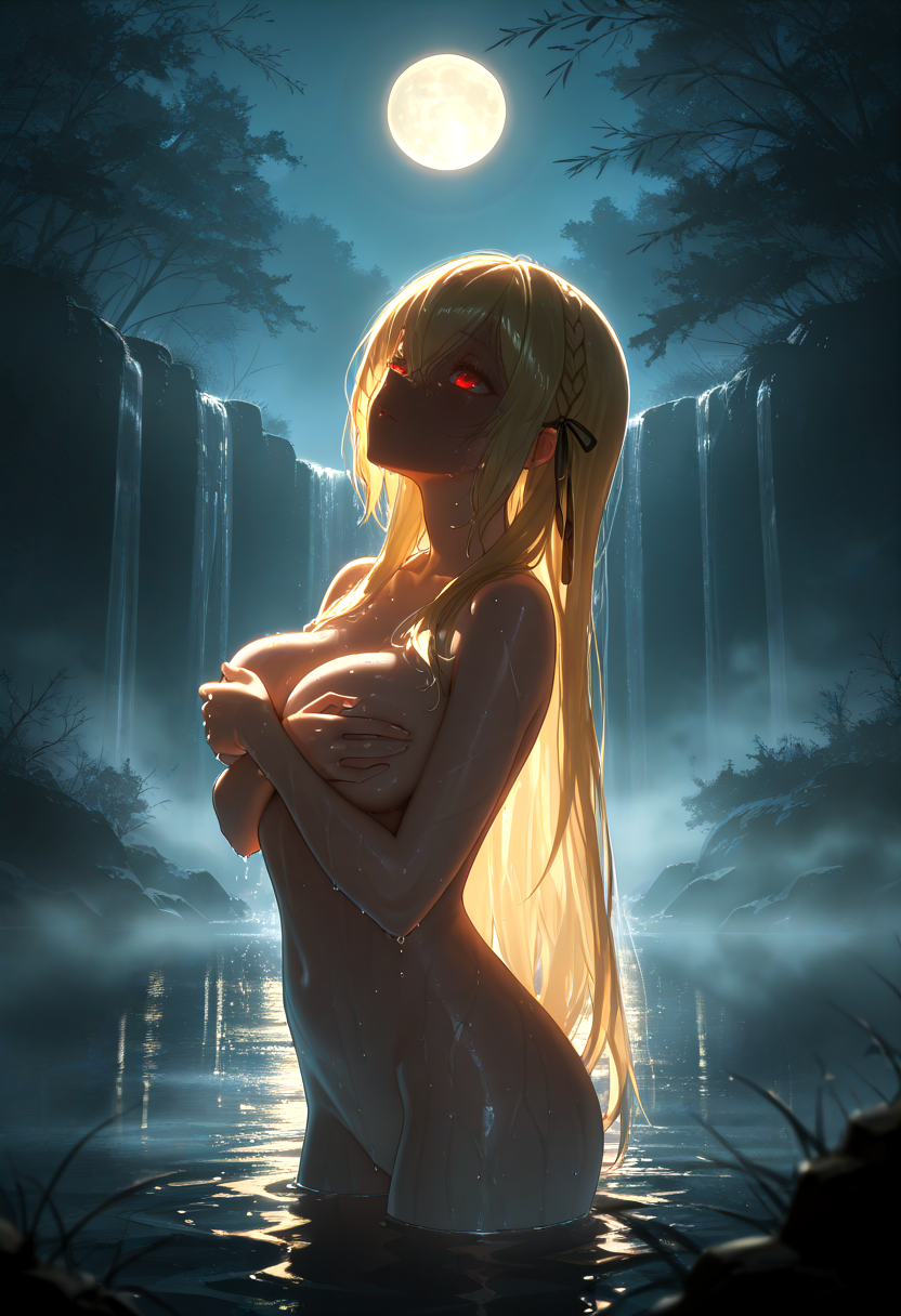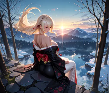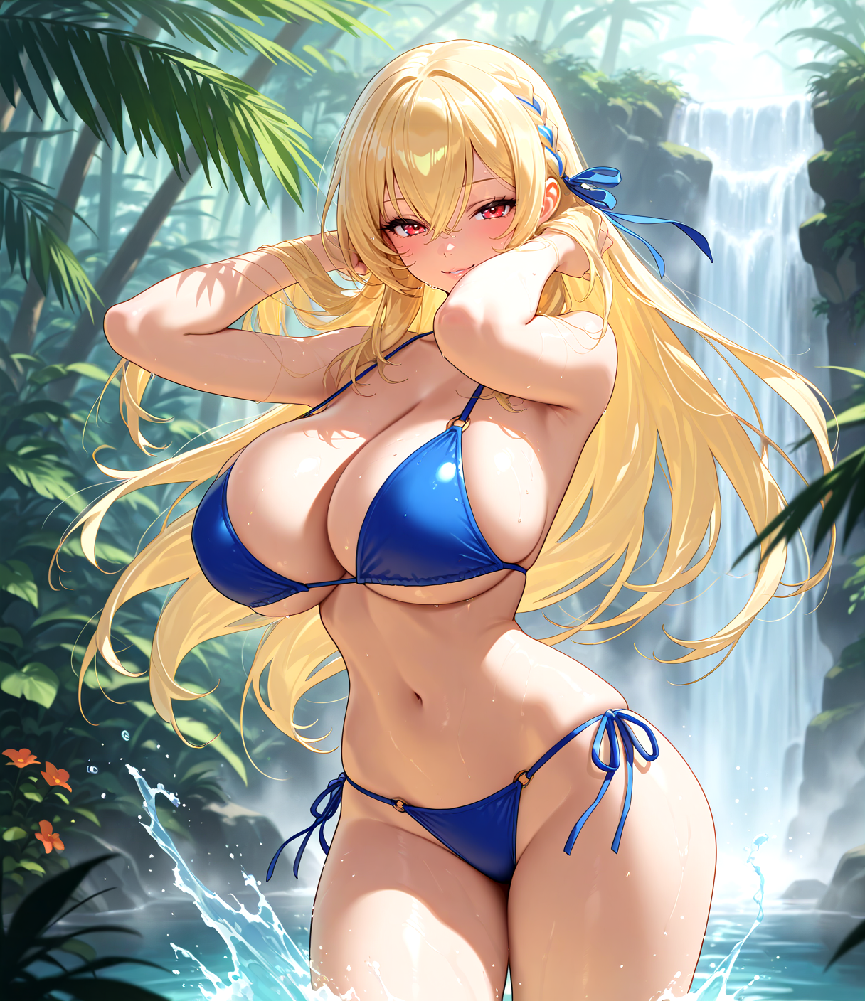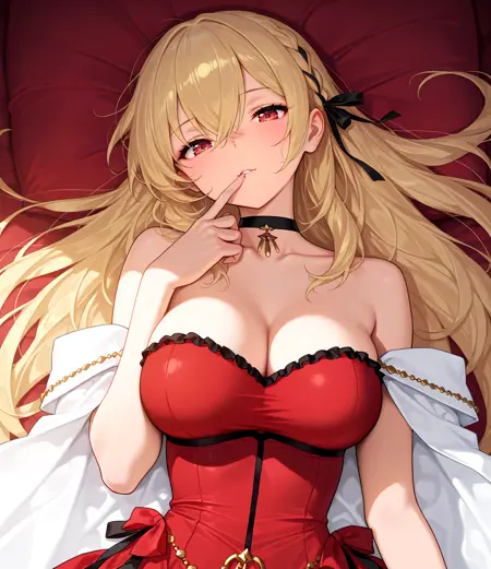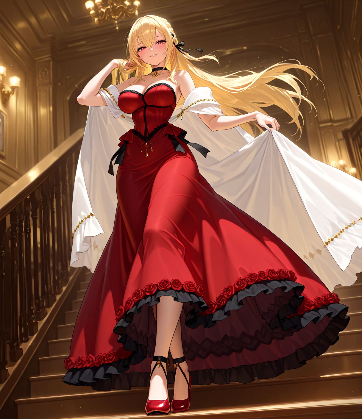 KGVdress, blonde hair, long hair, french braid, ribbon braid, hair ribbon, hair between eyes, red eyes, large breasts,cleavage, black choker, collarbone, red strapless dress, long dress, frills, off shoulder, white shawl, side bow, red bow, black bow, gold jewelry, red flower trim, red high heels, ankle strap,