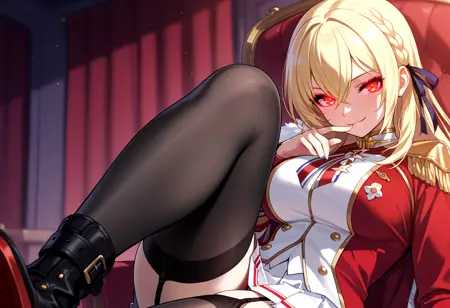 KGVdef, blonde hair, long hair, french braid, ribbon braid, hair ribbon, hair between eyes, red eyes, large breasts, military uniform, red coat, fur trim, gold trim, white pleated skirt, short skirt, double-breasted, neck ribbon, epaulettes, garter straps, black thighhighs, ankle boots, buckle boots, rudder footwear, zettai ryouiki,