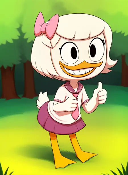 webby vanderquack, ducktales, duck, beak, scut tail, white skin, white hair, short hair, eyeliner, orange legs, webbed feet, black eyes,