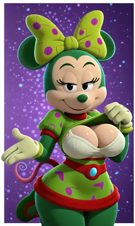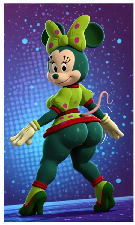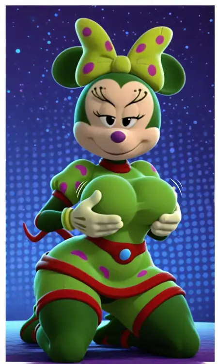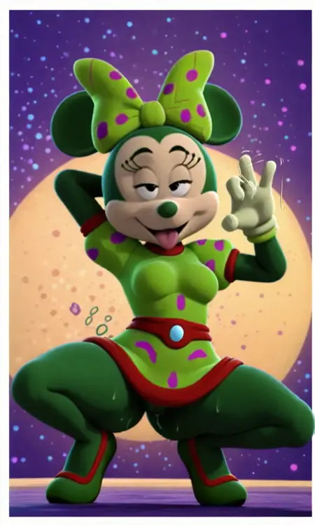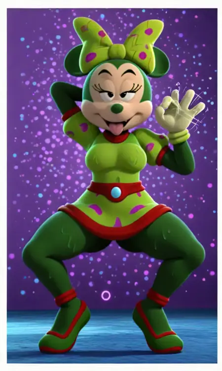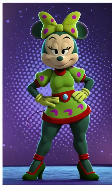 标签:martian_minnie, 深绿色毛发, 圆耳朵, 黑色眼睛, 手套, 绿色蝴蝶结, 绿色连衣裙, 腰带,泡泡袖,绿紫色裙子,绿色鞋子,老鼠尾巴