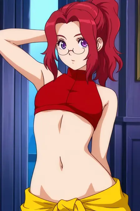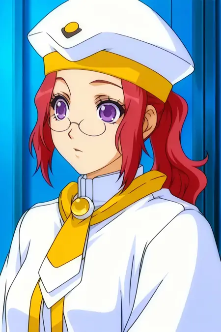atora monteverdi, 보라색 눈, 빨간 머리, 속눈썹, 꼬리머리, 이마, 흐트러진 머리카락, 핀스네즈, 안경, 둥근 안경, 프레임 없는 안경, 안경, 흰색과 노란색 유니폼, 오렌지 플래닛 회사 유니폼, 높은 칼라, 노란색 넥타이, 흰색 캐프레, 흰색 장갑, 손가락 없는 장갑, 금장식, 한 손 장갑, 한 손 손가락 없는 장갑, 애스콧, 흰색 머리장식, 브로치, 흰색 베레모, 노란색 띠, 흰색 드레스, 긴 드레스