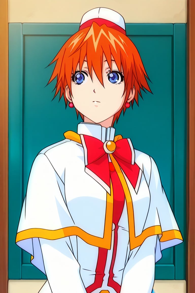 ayumi jasmine, 1girl, 파란색 눈, 짧은 주황색 머리, 매우 짧은 머리, 눈 사이의 머리카락, 귀걸이, 미니 모자, 긴 소매, 보석, 귀걸이, 흰색과 빨간색 유니폼, 빨간색 리본, 히메야 회사 유니폼, 캐프레, 빨간색 넥타이, 높은 칼라, 흰색 캐프레