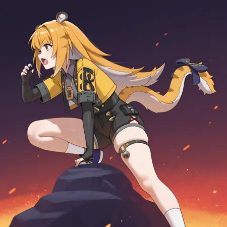 提示:ju_fufu, 尾巴弯曲, 吊坠, 短款夹克, 灰色衬衫, 肘部手套, 高腰短裤, 大腿绑带, 白色袜子, 运动鞋