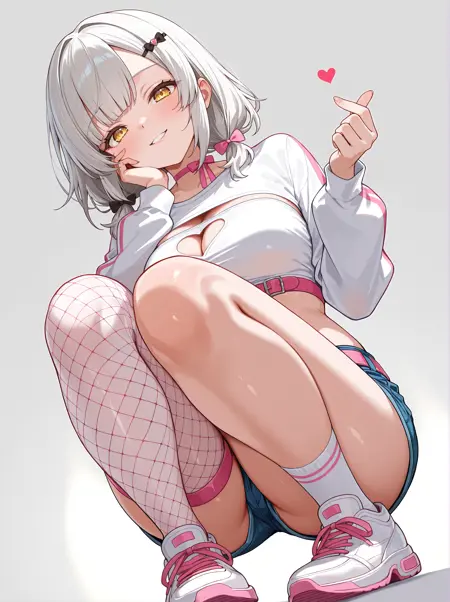 asymmetrical hair bows, black bow, pink bow, black bow hairpin, ribbon choker, white crop top, long sleeves, tube top, heart cutout, cleavage cutout, white fishnet tights, denim shorts, short shorts, pink belt, asymmetrical legwear, striped thighigh, pinstripes, white thighigh, heart o-ring, sneakers, pink laces
