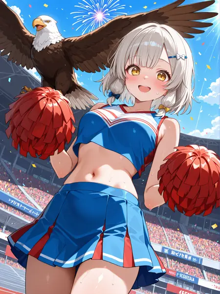 asymmetrical hair bows, red bow, blue bow, white bow hairpin, red white and blue cheerleader uniform, red and blue pom poms, bare shoulders