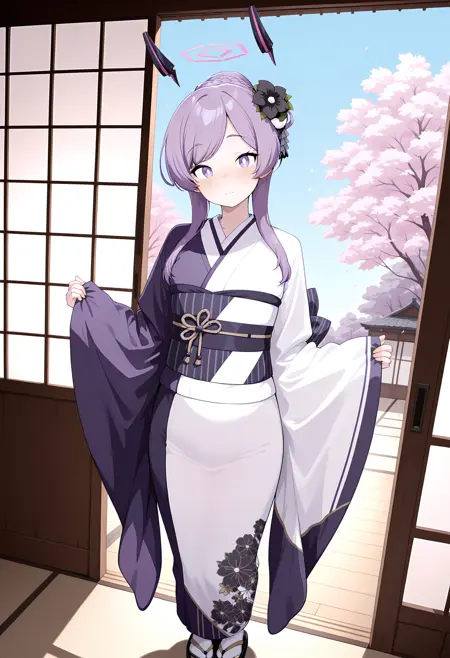 紫色和服,白色和服,双色和服,宽大长袖,腰带,腰带绳,腰带结,花卉图案,白色足袋,黑色木屐,厚底凉鞋,