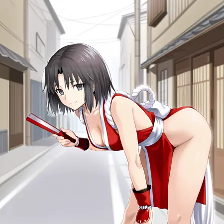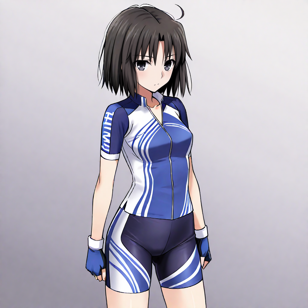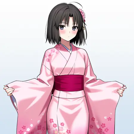 • Trigger : Shiki, 1girl, ryougi shiki, blue kimono, red jacket, japanese clothes, short hair, black hair, sash, open jacket, open clothes, obi, brown footwear, long sleeves, cowboy shot