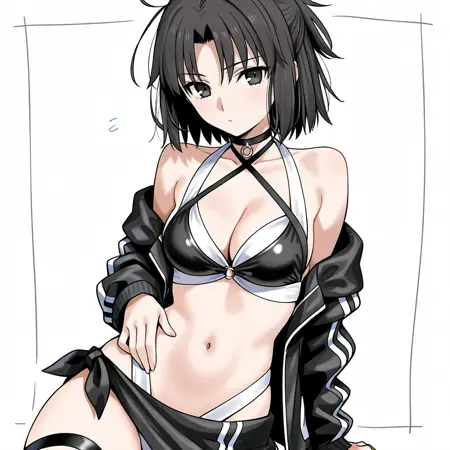 ShikiBikini, 1girl, solo, swimsuit, black bikini, medium breasts, navel, black hair, thigh strap, sarong, ryougi shiki, black jacket, halterneck, cleavage, short hair, off shoulder, black eyes, parted bangs, open clothes, choker, criss-cross halter, bare shoulders, collarbone, stomach, long sleeves