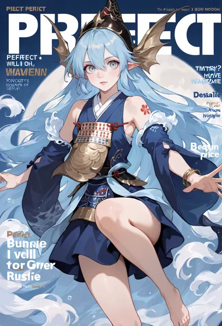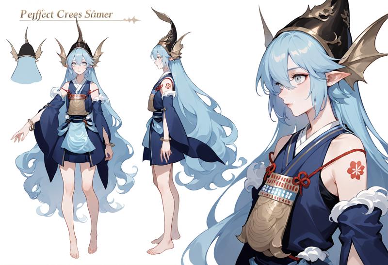 **默认皮肤:**1girl,灰眼睛,长发,白眼,蓝发,蓝眼睛,极长发,发丝遮眼,刘海,裸露肩膀,头翼,头盔,角,尖耳,头鳍,头饰,珠宝,手镯,盔甲,宽袖,蓝色和服,可拆卸袖子,和服,蓝色连衣裙,日本服饰,连衣裙,长袖,裸露腿部,纹身,赤脚