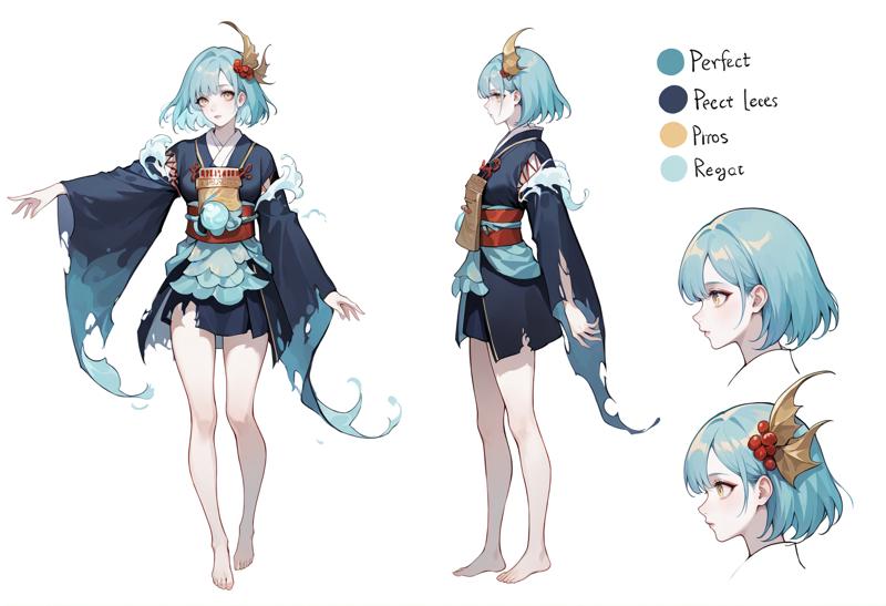 **替代皮肤1:**1girl,黄眼睛,多色头发,短发,蓝发,水蓝色头发,刘海,发饰,胸部,白皙皮肤,裙子,和服,日本服饰,长袖,宽袖,腰带,腰带,破旧衣物,裸露腿部,赤脚