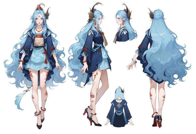 **替代皮肤2:**1girl,蓝眼睛,长发,蓝发,极长发,发饰,额头印记,尖耳,珠宝,耳环,连衣裙,项链,珠饰,指甲油,红指甲,手镯,中国服饰,蓝色连衣裙,长袖,流苏,裸露腿部,纹身,腿部纹身,脚链,高跟鞋