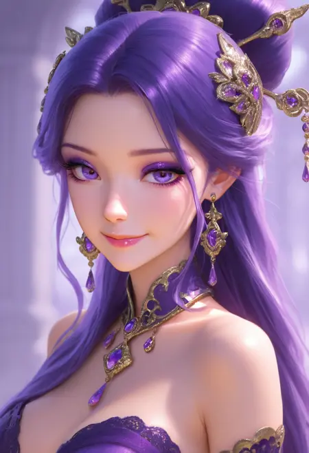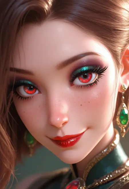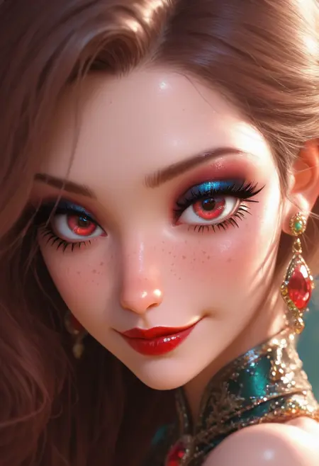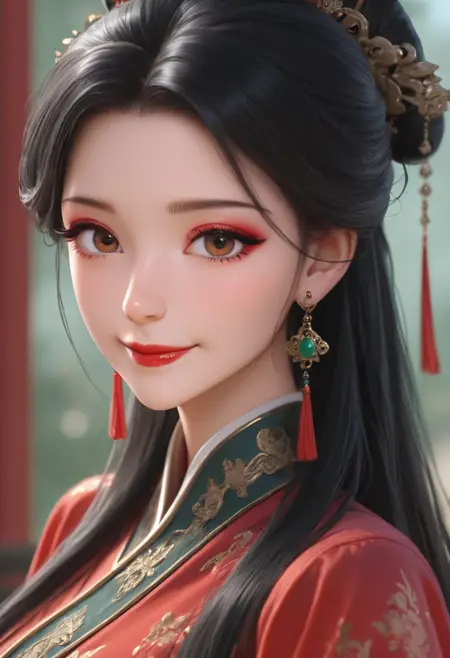 char5, 1girl, solo, earrings, jewelry, black hair, long hair, looking at viewer, hair ornament, brown eyes, smile, blurry, blurry background, portrait, red lips, makeup, closed mouth, chinese clothes, lipstick, depth of field