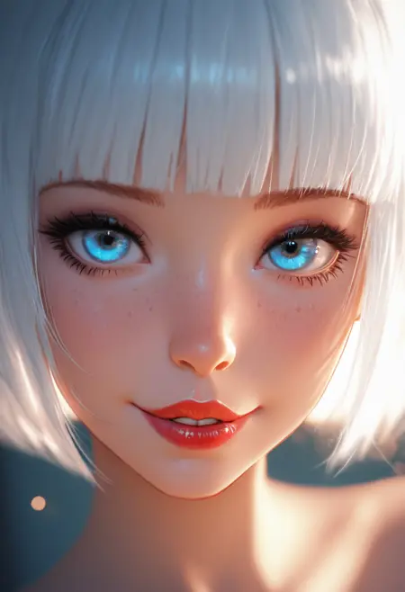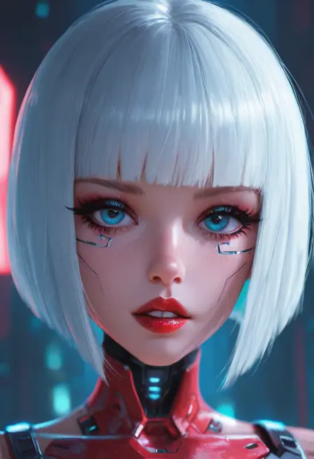 char2, 1girl, solo, looking at viewer, blue eyes, freckles, short hair, cyberpunk, white hair, blurry, makeup, glowing, red lips, blurry background, bodysuit, parted lips, upper body, lips, from side, lipstick, science fiction, cyborg, smile