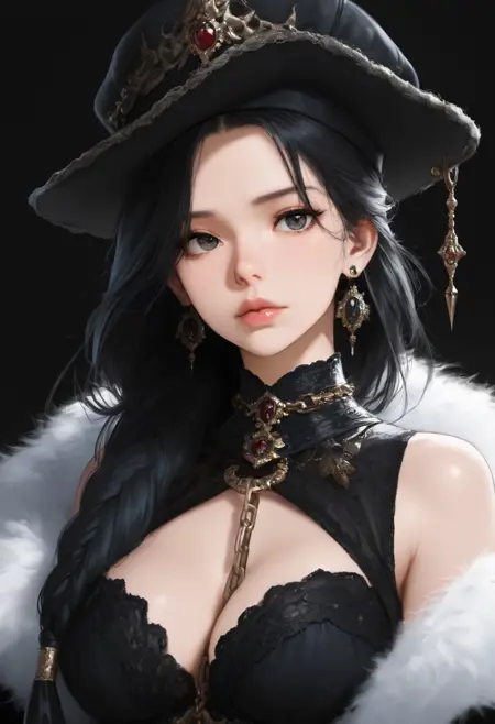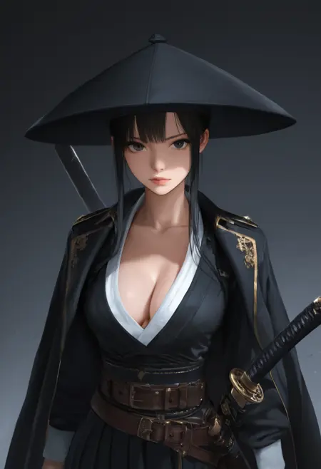 ot1, 1girl, solo, breasts, hat, weapon, sword, black hair, looking at viewer, holding, holding weapon, long hair, black headwear, braid, black background, black nails, holding sword, sash, breasts apart, realistic, cleavage, fur trim, medium breasts, dress, standing