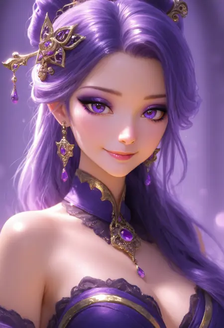 char6, 1girl, solo, long hair, earrings, jewelry, purple eyes, multicolored hair, purple hair, looking at viewer, dark-skinned female, blurry background, dark skin, black hair, upper body, blurry, gem, glowing, closed mouth, two-tone hair, armor, floating hair, lips