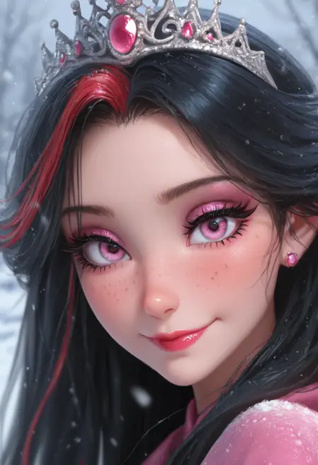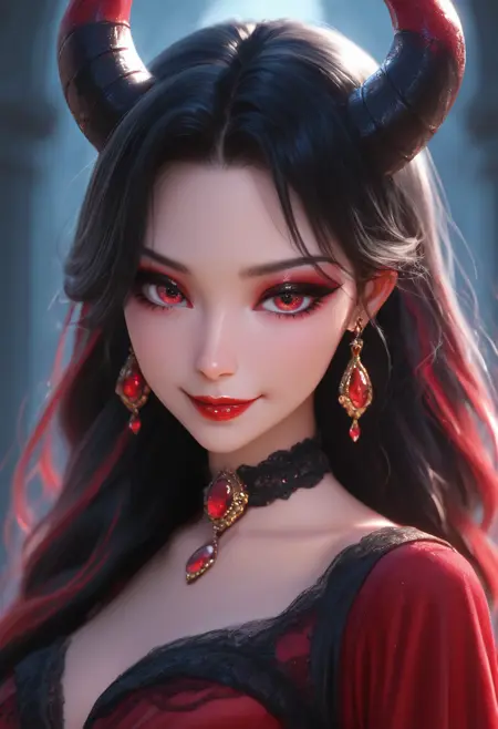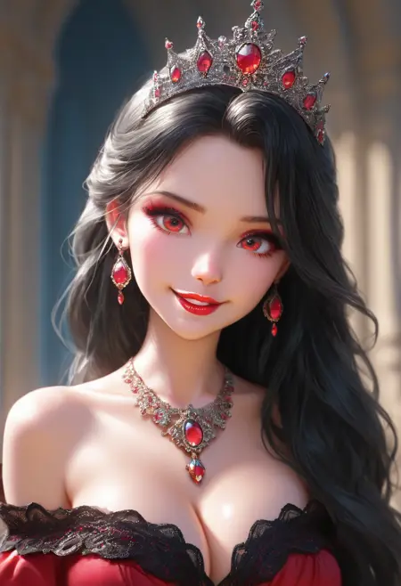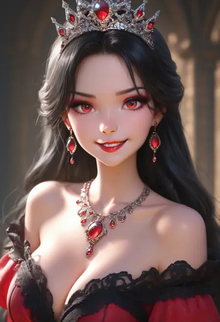 char7, 1girl, jewelry, red eyes, solo, long hair, black hair, earrings, looking at viewer, red lips, necklace, breasts, makeup, crown, cleavage, blurry, dress, bare shoulders, blurry background, tiara, lipstick, gem, collarbone, upper body, off shoulder, smile, teeth, lips