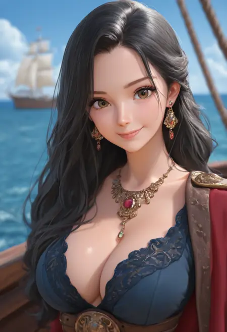 char4, 1girl, breasts, solo, jewelry, earrings, black hair, long hair, cleavage, smile, looking at viewer, watercraft, brown eyes, large breasts, ship, day, blurry, ocean, upper body, sky, outdoors, blurry background, lips, blue sky, closed mouth