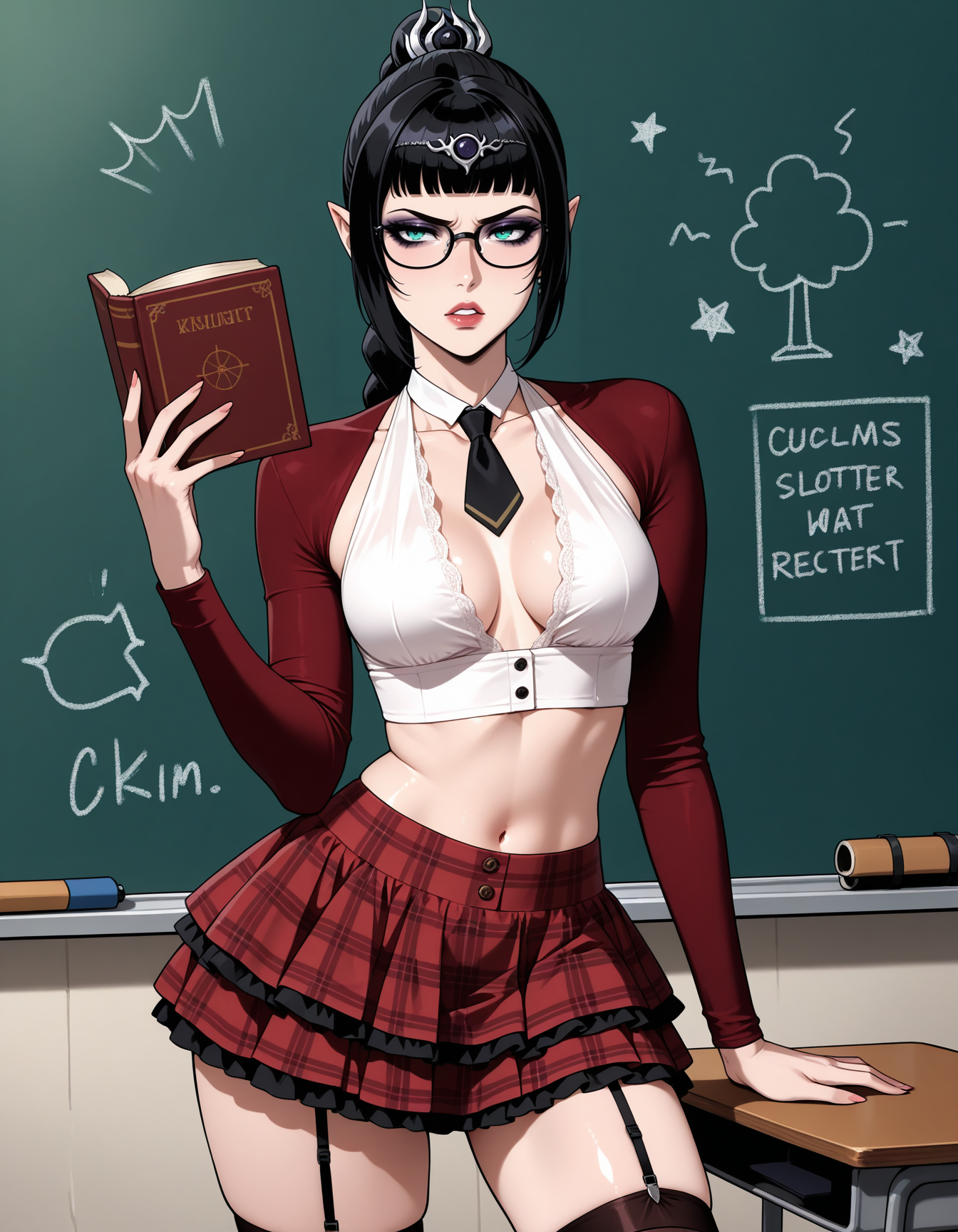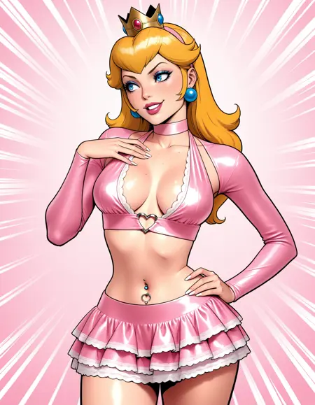 I enjoy this with: shiny satin, wrinkled_fabric, pink halterneck, frills, midriff, navel, hairband, breasts apart, plunging neckline, miniskirt, layered skirt, hairband