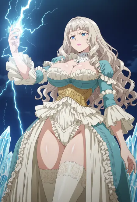 fmwl_(ge)、成熟した女性、高貴、ミルフ、巨乳、大きなお尻、プラチナブロンド、長い波状の髪、カールした髪、青い目、口の下の一つのほくろ、胸元、ガウン、コルセット、白いドレス、薄い青いドレス、ショーガール風ドレス、太ももまでの靴下、白い太ももまでの靴下、フリル、白いパンツ、フリル付きパンツ、ハイレグ、ピンクの唇