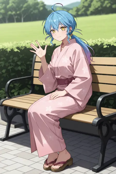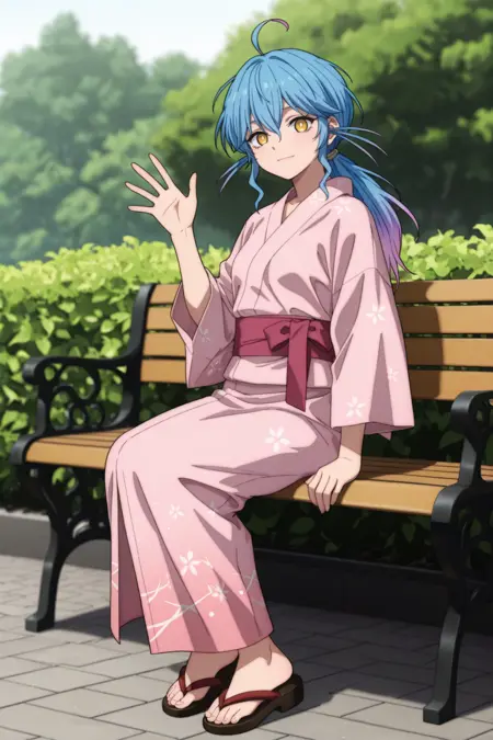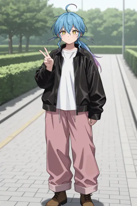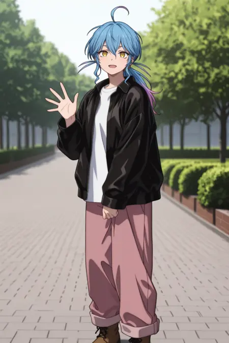외모: 파란 머리, 긴 머리, 토끼꼬리, 눈 사이의 머리카락, 그라데이션 머리, 아호게, 낮은 토끼꼬리, 옆머리, 다색 머리, 노란 눈, 흰 동공