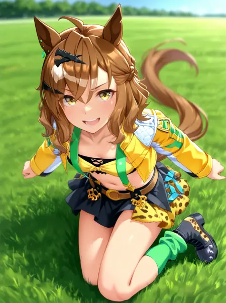 馬の耳、切り欠き耳、耳 piercing、馬の尾、腹部、レオパード柄ブラックアンクルブーツ、部分的なレオパードリボンブラックミニスカート、グリーンアシンメトリックスOCKS、へそ、茶色のベルト、ロングスリーブ、ツートーンバンドー、オープンジャケット、イエロークロップドジャケット、ブラックヘアクリップ、グリーンサスペンダー