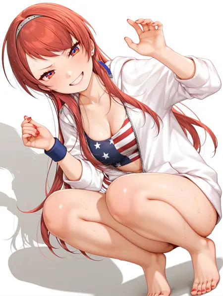 水着 ・n_m_clothes,open hoodie,hood down,white hoodie,american flag print sports bra,red bikini under clothes,red nails,nail polish,wristband,toenail polish,toenails,barefoot,