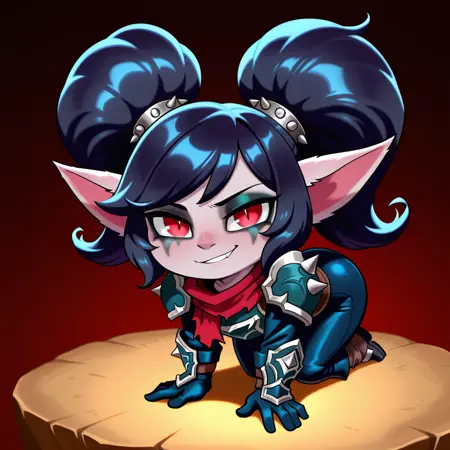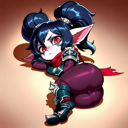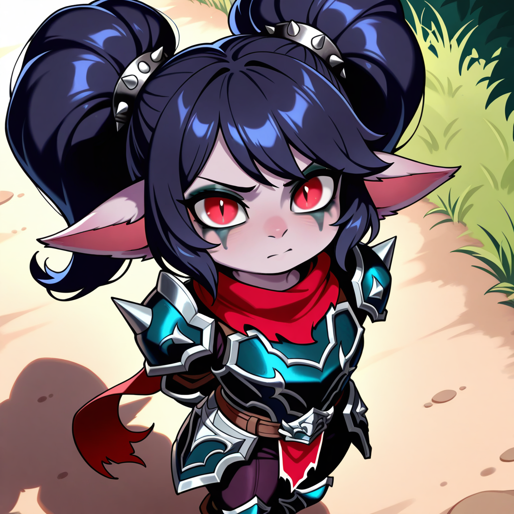lolnoxuspp, 1girl, solo, yordle, shortstack, pointy ears, colored skin, purple skin, red eyes, makeup, red scarf, black hair, twintails, armor, gloves