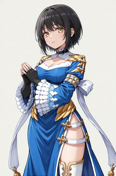 プロンプト:cardiRO、ゴールドのトリム、タートルネック、十字架、広い袖、フリル付き袖、ブラックのフィンガーレス肘手袋、衣装のカットアウト、胸元のカットアウト、長い青いドレス、サイドスリットドレス、白いサッシュリボン、ブラックのチョーカー、白い太ももブーツ、ロスラッセされた靴、