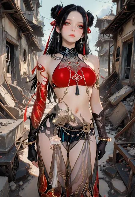 V2.0トリガー単語: jj yingying,(red top:0.7),jewelry,bracelet,breasts,midriff,black gloves,tattoo,bare shoulders,crop top,armlet,arm tattoo,baggy pants,hip vent,single glove,see-through,harem pants,ribbon,