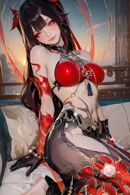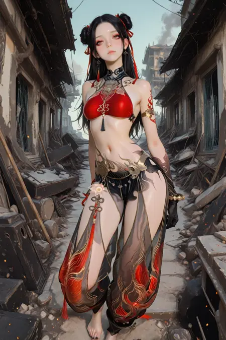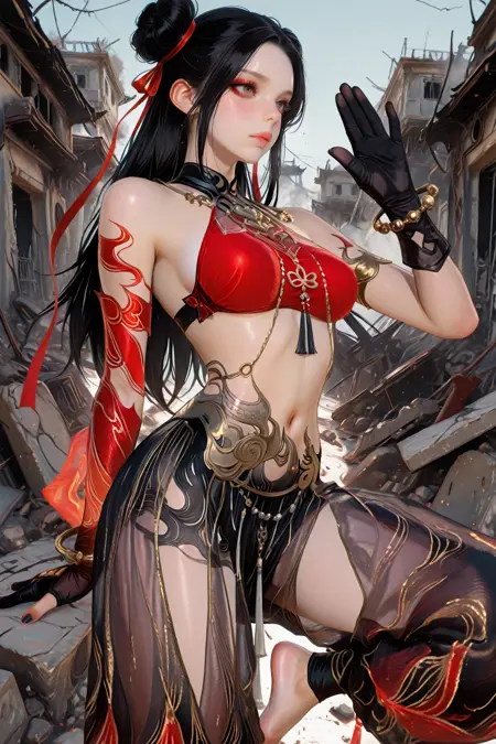 V1.0トリガー単語:Ji Yingying,1girl,jewelry,navel,midriff,anklet,armlet,back tattoo,bandeau,bare shoulders,barefoot,black gloves,harem pants,see-through,red top,(flame pattern:1.3),black pants,underboob,nylon texture,