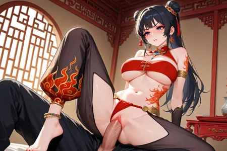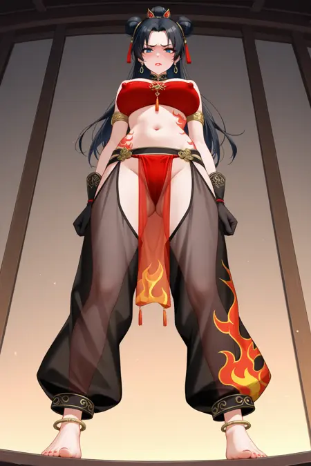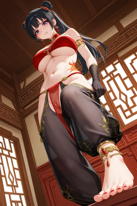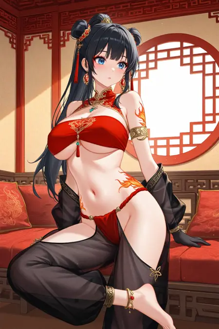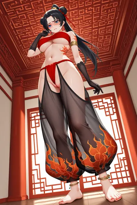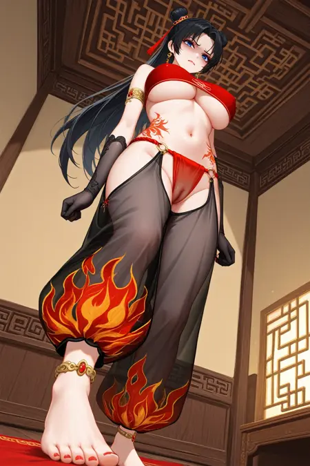 V1.0トリガー単語:Ji Yingying,1girl,jewelry,navel,midriff,anklet,armlet,back tattoo,bandeau,bare shoulders,barefoot,black gloves,harem pants,see-through,red top,(flame pattern:1.3),black pants,underboob,nylon texture,
