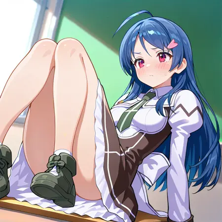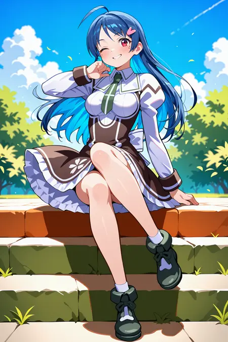 mitonoya_saki,blue hair, ahoge,red eyes,mark under eye,hair ornament,hairclip,