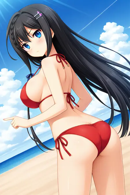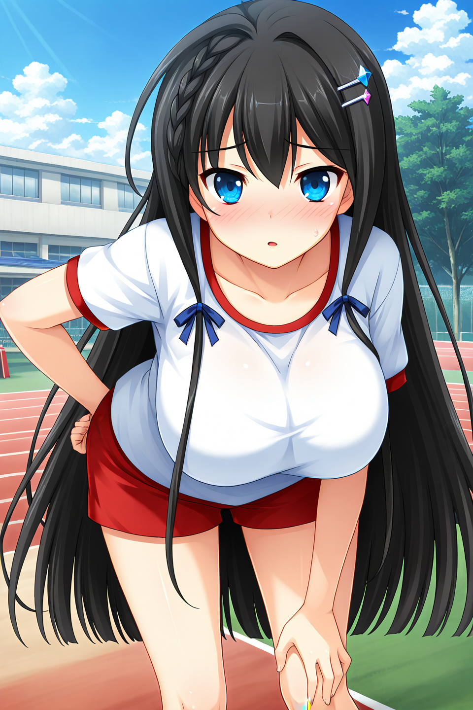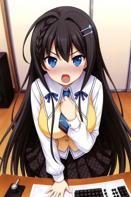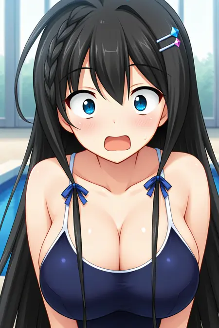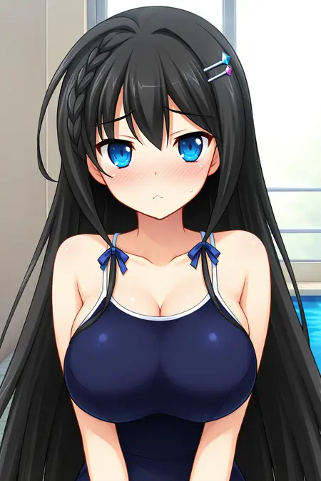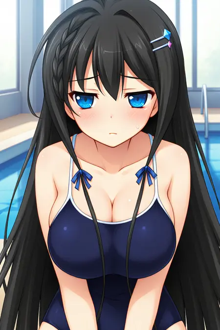 aoki natsume, blue eyes, black hair, very long hair, hair intakes, ahoge, hair between eyes, sidelocks, side braid, single braid, hair over breasts, hair ribbon, blue ribbon, hairpin,