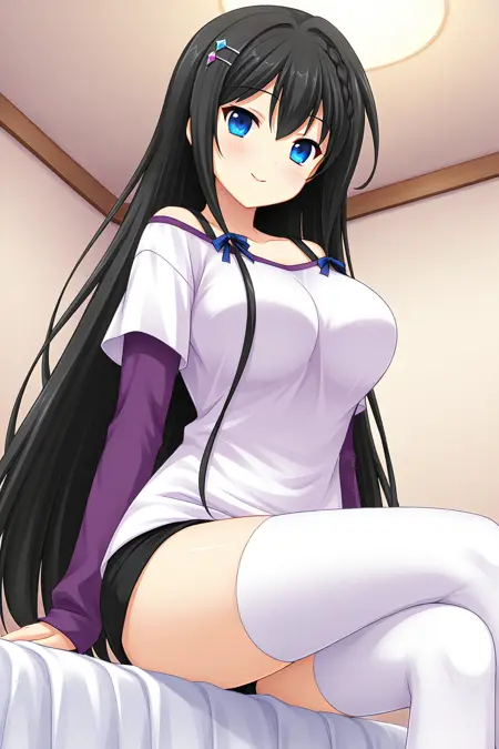 white t-shirt, short sleeves, purple line, off-shoulder shirt, impossible shirt, collarbone, bare shoulders, purple shirt, long sleeves, layered sleeves, short over long sleeves, black shorts, short shorts, zettai ryouiki, white thighhighs,