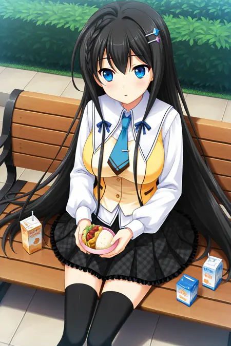 school uniform, white collar, sailor collar, yellow vest, blue necktie, tie clip, white shirt, long sleeves, untucked shirt, waist ribbon, yellow ribbon, black skirt, miniskirt, plaid skirt, pleated skirt, zettai ryouiki, black thighhighs, loafers, brown footwear,