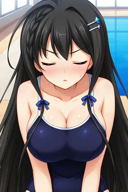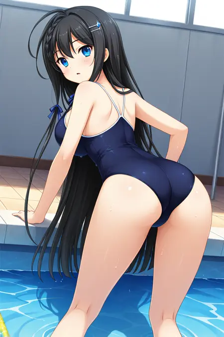 competition school swimsuit, blue one-piece swimsuit, bare shoulders, bare legs,