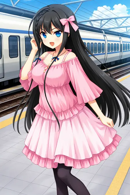 casual, hair bow, pink bow, necklace, pink dress, off-shoulder dress, frilled dress, impossible dress, taut dress, long sleeves, wide sleeves, sleeves past elbows, pink skirt, layered skirt, black pantyhose,