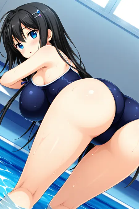 competition school swimsuit,blue one-piece swimsuit,bare shoulders,bare legs,