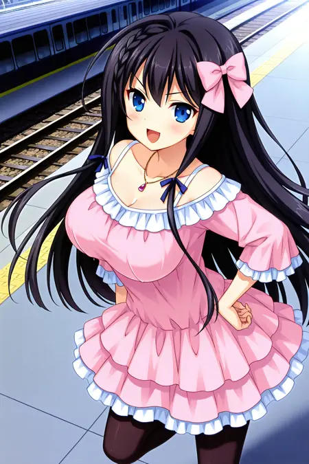 casual,hair bow,pink bow,necklace,pink dress,off-shoulder dress,frilled dress,impossible dress,taut dress,long sleeves,wide sleeves,sleeves past elbows,pink skirt,layered skirt,black pantyhose,