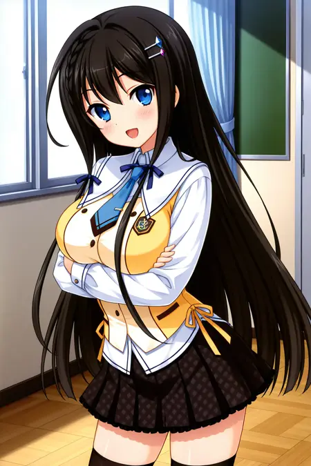 school uniform,white collar,sailor collar,yellow vest,blue necktie,tie clip,white shirt,long sleeves,untucked shirt,waist ribbon,yellow ribbon,black skirt,miniskirt,plaid skirt,pleated skirt,zettai ryouiki,black thighhighs,loafers,brown footwear,