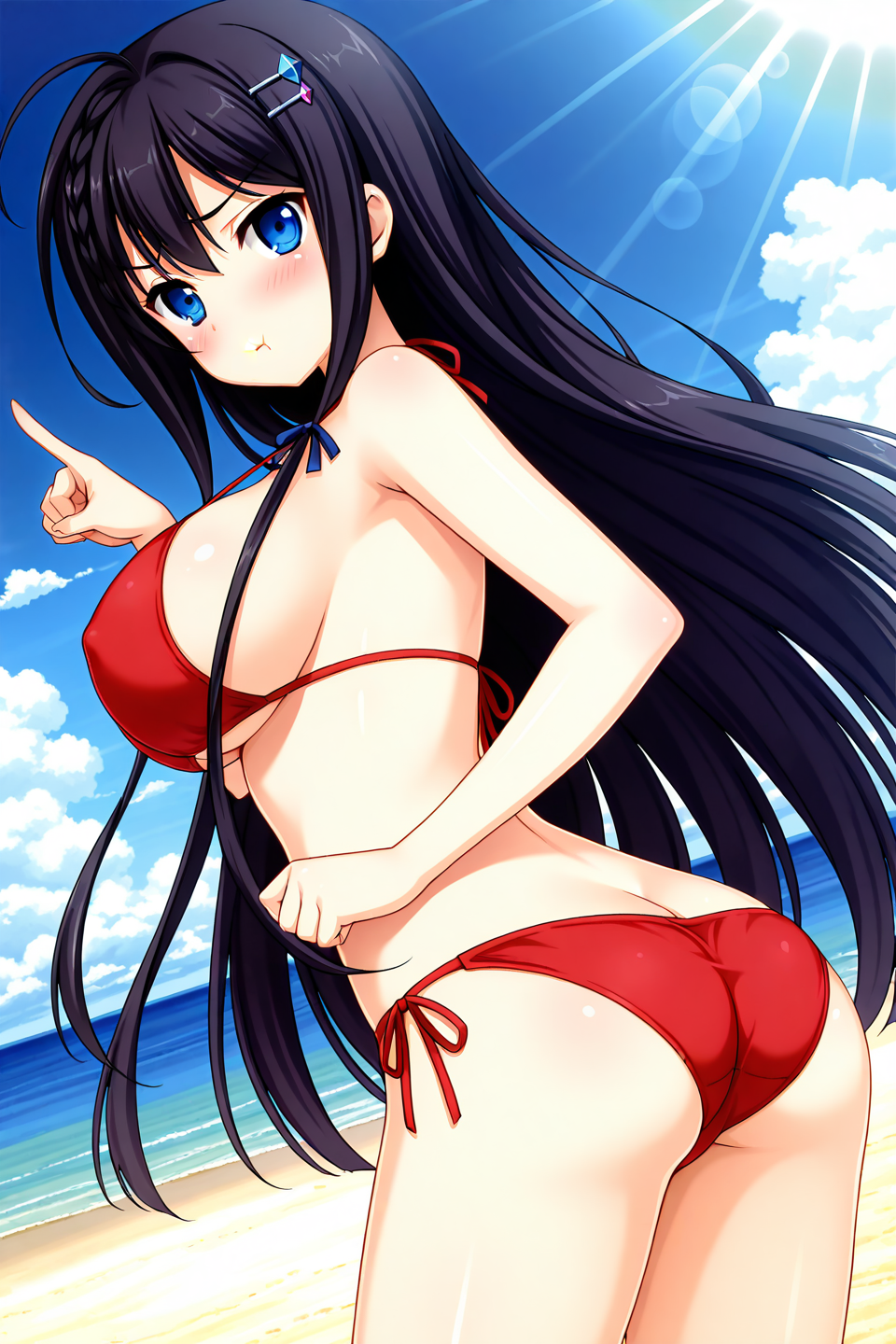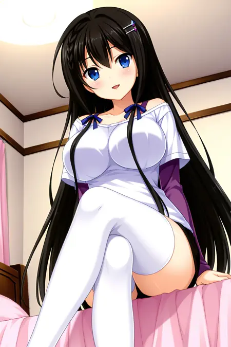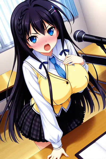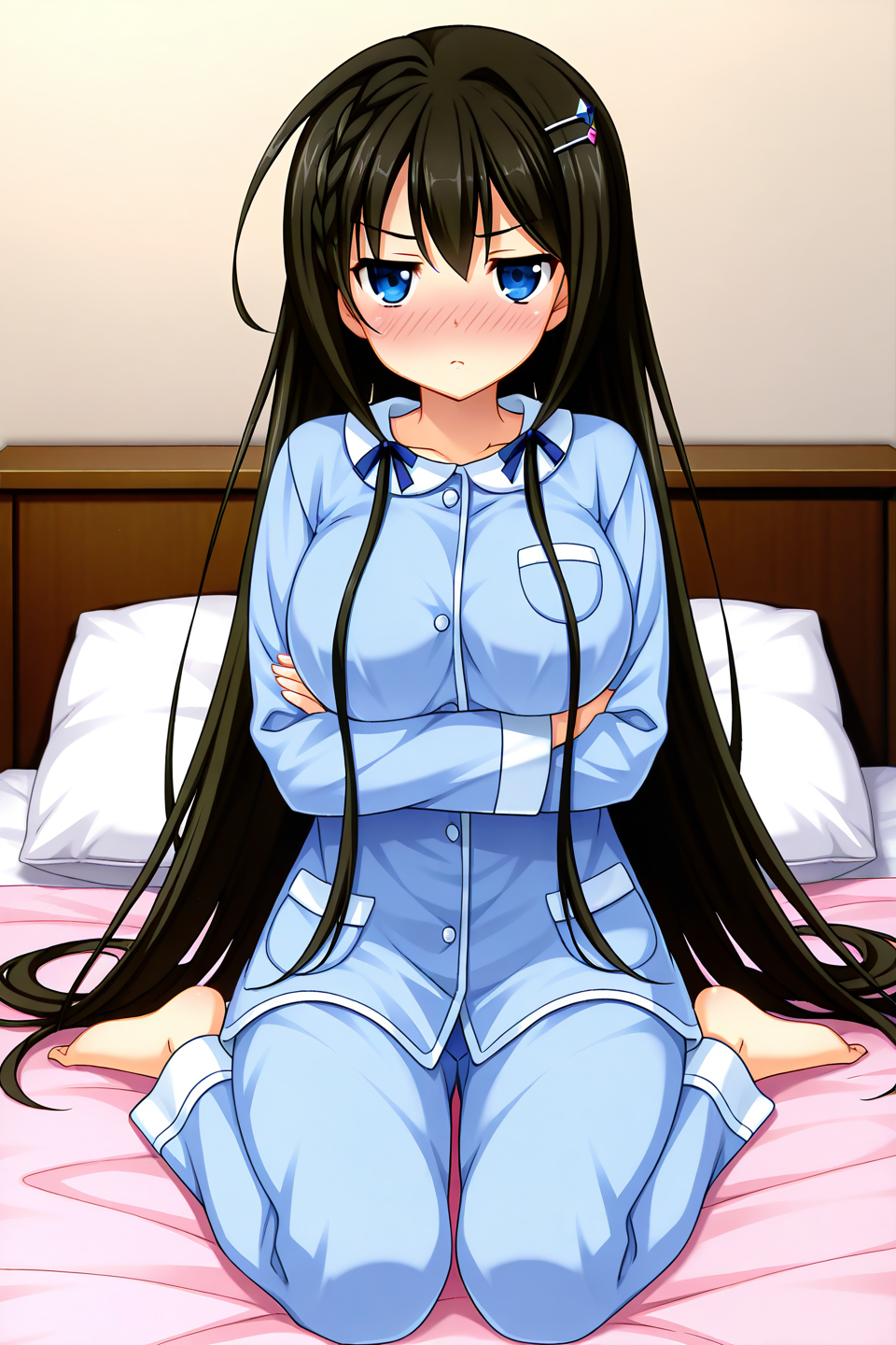 aoki natsume,blue eyes,black hair,very long hair,hair intakes,ahoge,hair between eyes,sidelocks,side braid,single braid,hair over breasts,hair ribbon,blue ribbon,hairpin,