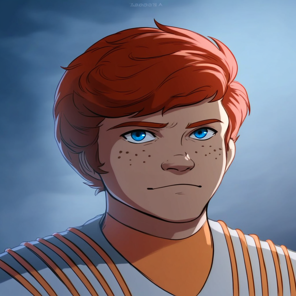 Zarru, 1boy, solo, male focus, Red hair, freckles, blue eyes,